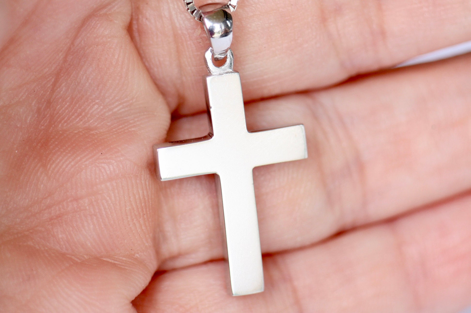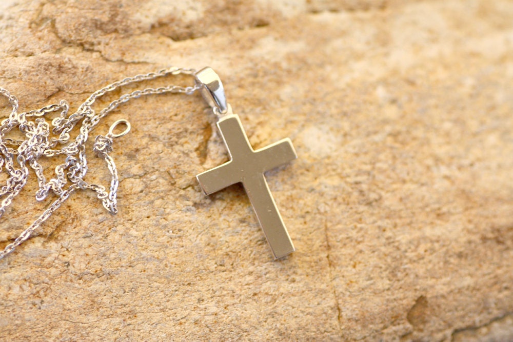 White Gold Cross Necklace for men, Christening boy cross in solid gold or Sterling silver in plain and simple lines.