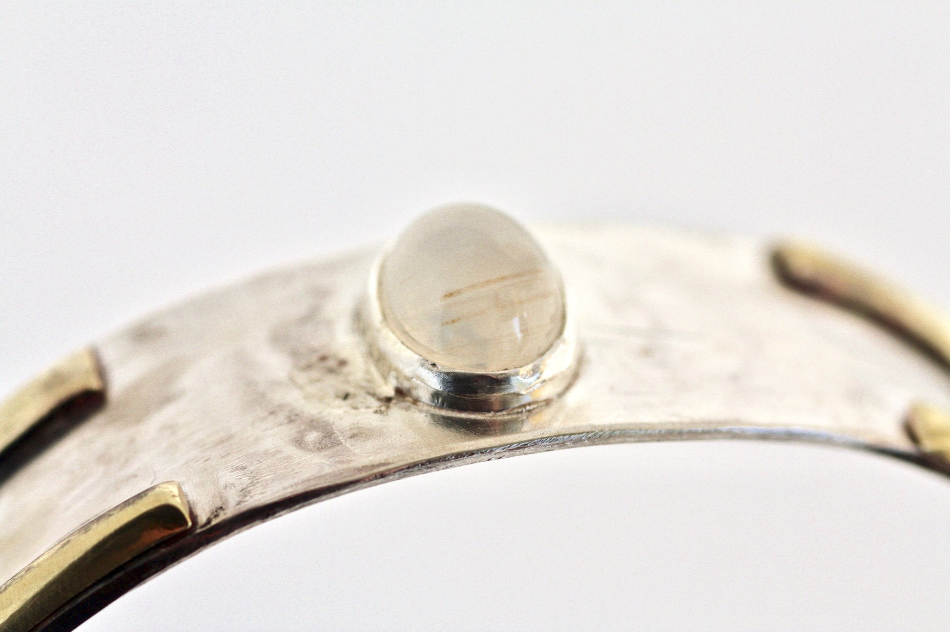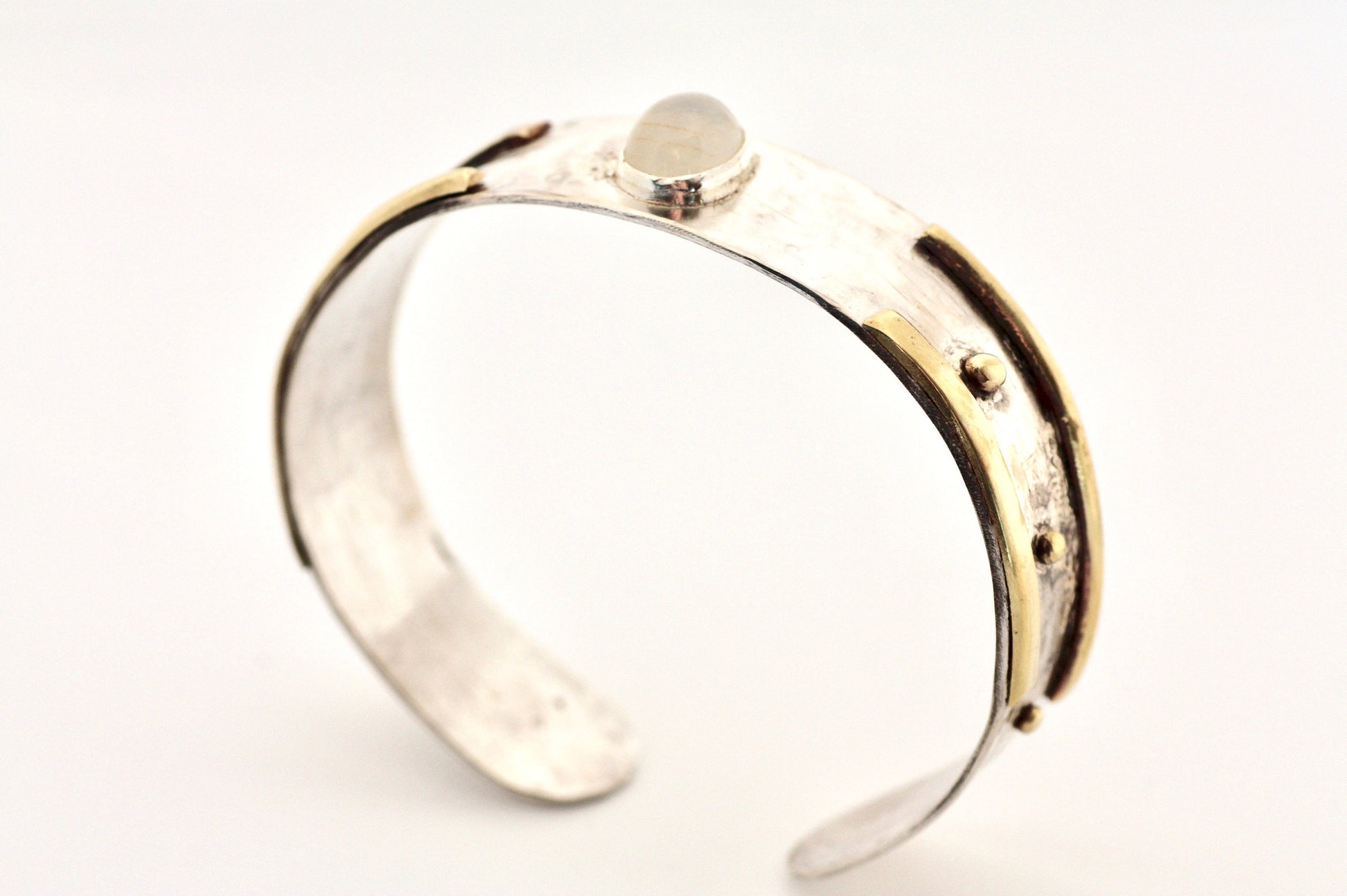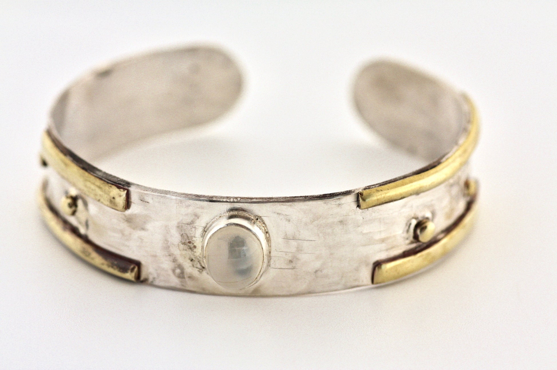 White Moonstone Rustic Sterling Silver and Brass Cuff