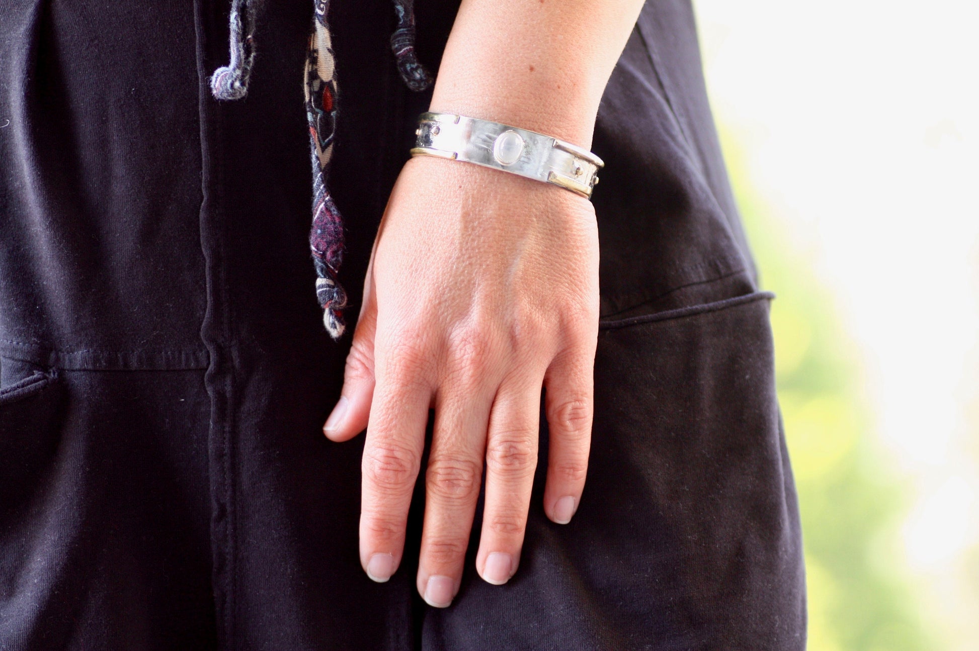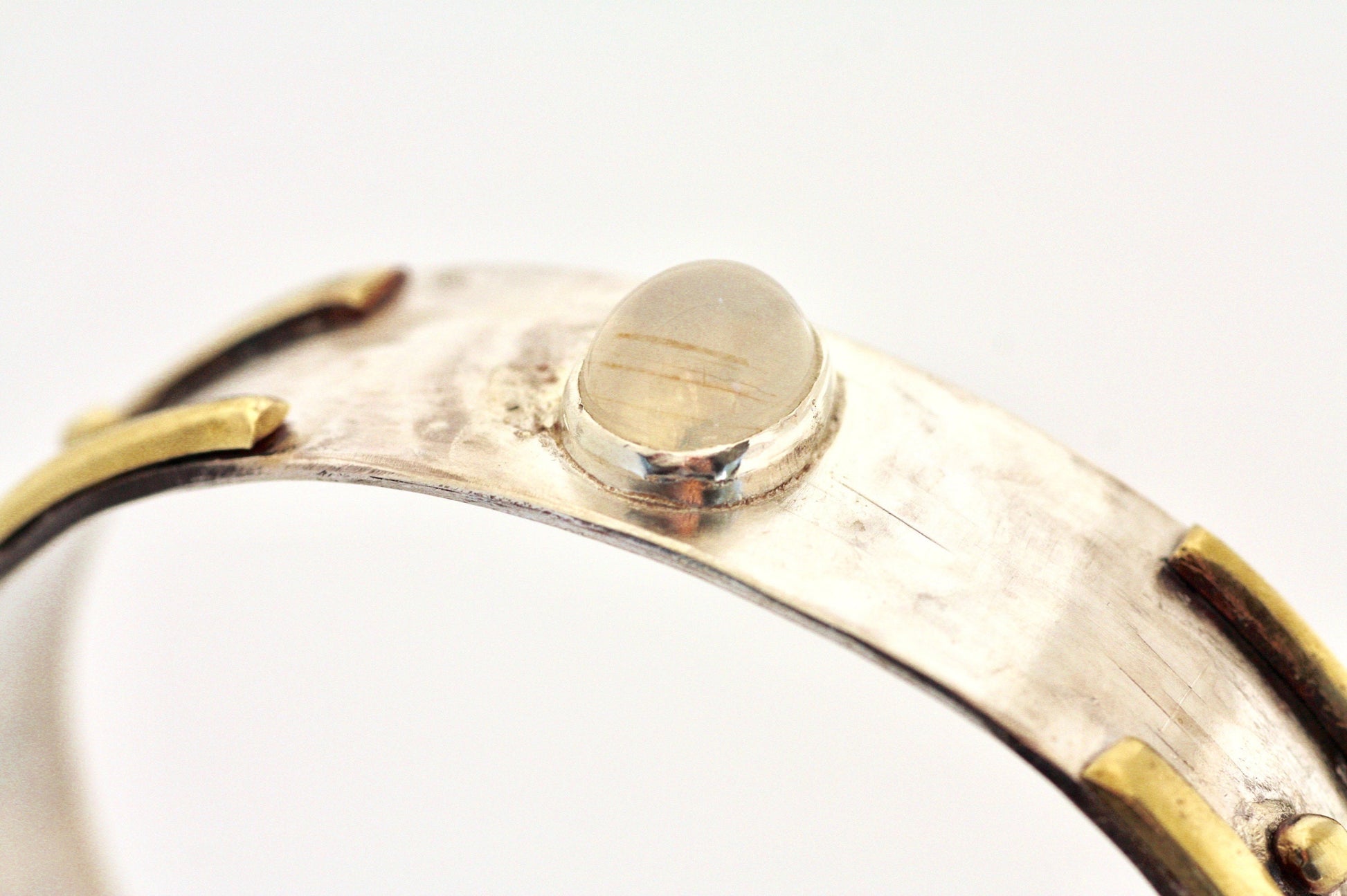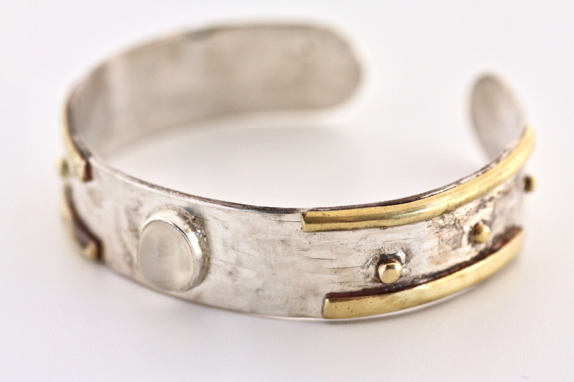 White Moonstone Rustic Sterling Silver and Brass Cuff